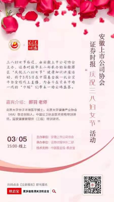 為豐富行業(yè)文化建設(shè),致敬會(huì)員單位廣大女性工作者為安徽資本市場(chǎng)高質(zhì)量發(fā)展做出的貢獻(xiàn),值此“三八”國(guó)際婦女節(jié)來(lái)臨之際,我會(huì)于3月5日舉辦安徽上市公司線上健康講座活動(dòng),轄區(qū)30余家上市公司的高管及相關(guān)行業(yè)人士約90余人參加活動(dòng)。