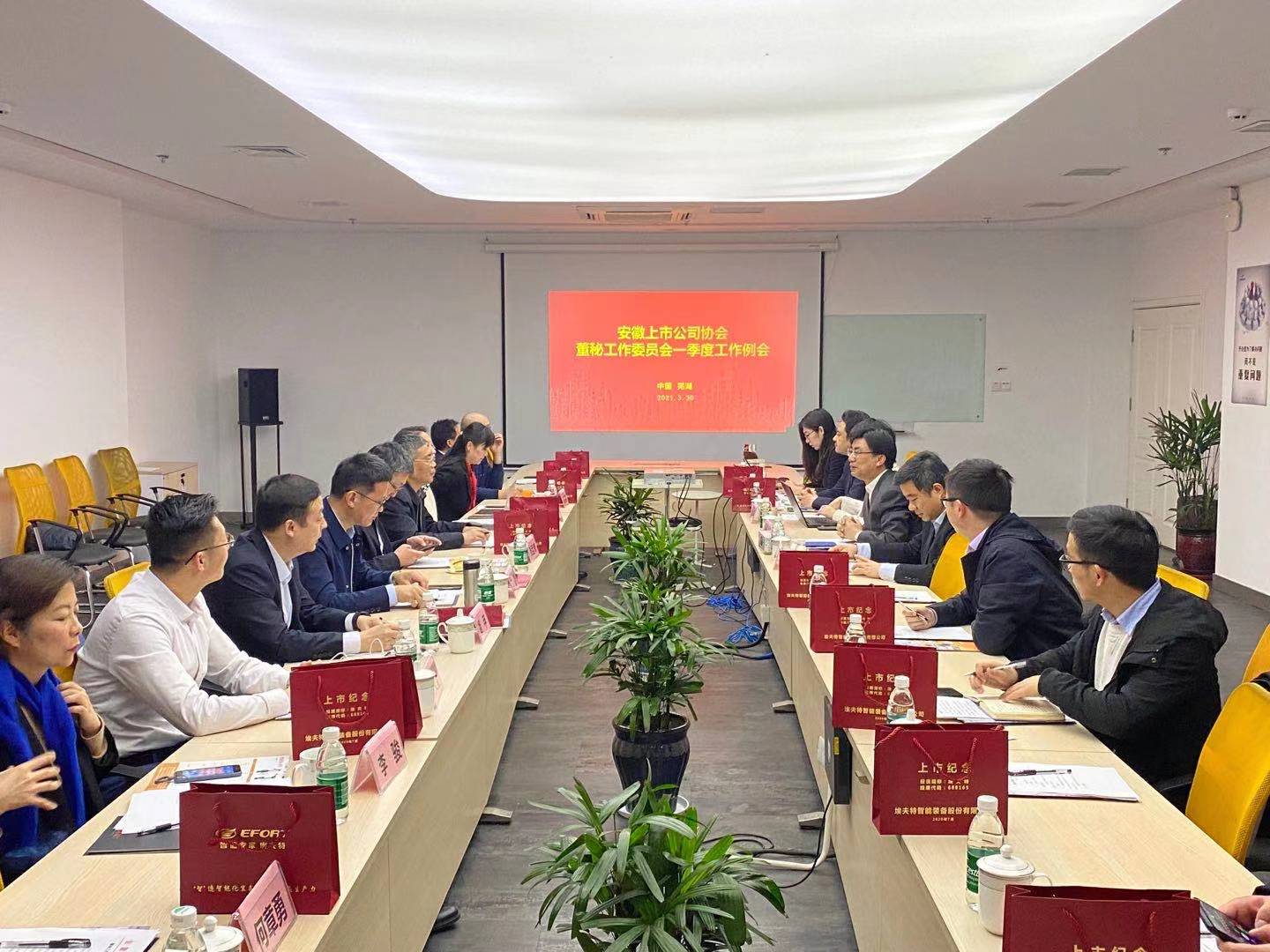 3月30日,安徽上市公司協(xié)會董秘工作委員會2021年一季度工作例會在蕪湖召開,委員及相關(guān)上市公司董秘20余人參會。會議由主任委員張孟青主持,我會副會長兼秘書長袁宏生出席。埃夫特董事長許禮進應(yīng)邀出席并致辭。