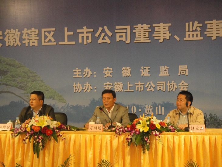 2010年10月16日-17日,由安徽證監(jiān)局主辦、安徽上市公司協(xié)會(huì)協(xié)辦的轄區(qū)2010年度上市公司董、監(jiān)事培訓(xùn)班在黃山舉辦。中國證監(jiān)會(huì)有關(guān)領(lǐng)導(dǎo)和專家、深交所及相關(guān)中介機(jī)構(gòu)專家,就上市公司監(jiān)管形勢、誠信規(guī)范、內(nèi)幕交易防控、董監(jiān)事的權(quán)利義務(wù)及責(zé)任、上市公司信息披露、上市公司再融資及并購重組等內(nèi)容進(jìn)行了重點(diǎn)講解。
